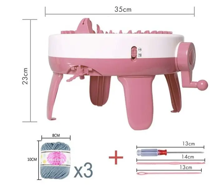 El juego incluye: tabla de tejer, una aguja de tejer doble, 2 agujas de tejer, ajustador elástico y 3 bolas de hilo en 3 colores surtidos.